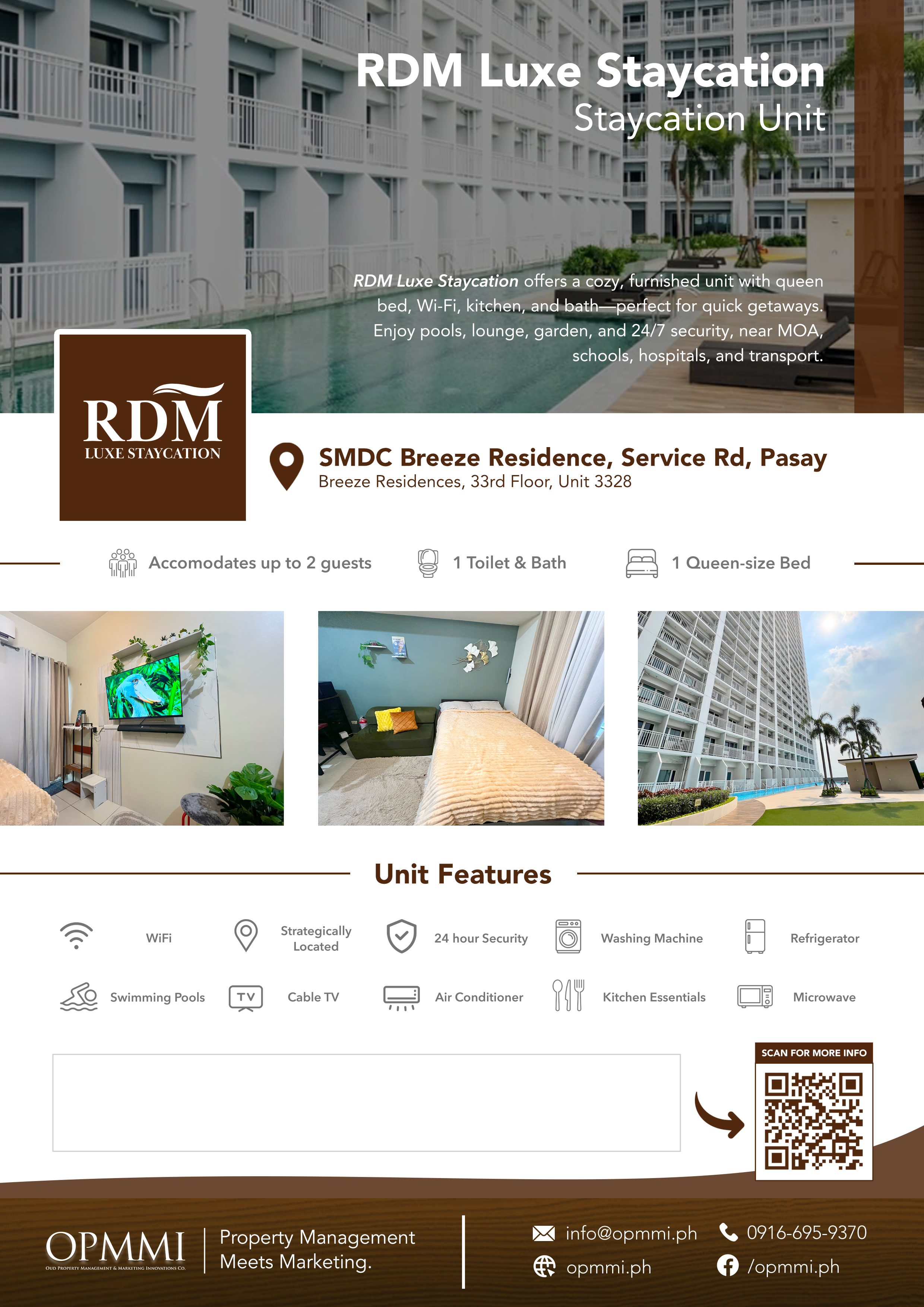 We produce unique, high-quality images, social media contents, and brochures that elevate the look of your unit, making it stand out as one of the most premium listings on the market. While many people own staycation units, few have professional-grade marketing assets — but you will.